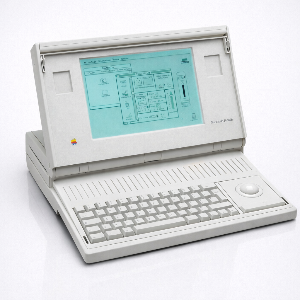 Apple's first laptop attempt. It weighed 16 pounds. The battery had to be charged even to use it plugged in. And yet — it had a beautiful backlit active-matrix display, a trackball, and sold for $6,500. The backlit model is the desirable one. A machine that was ahead of its time in every way except weight.
